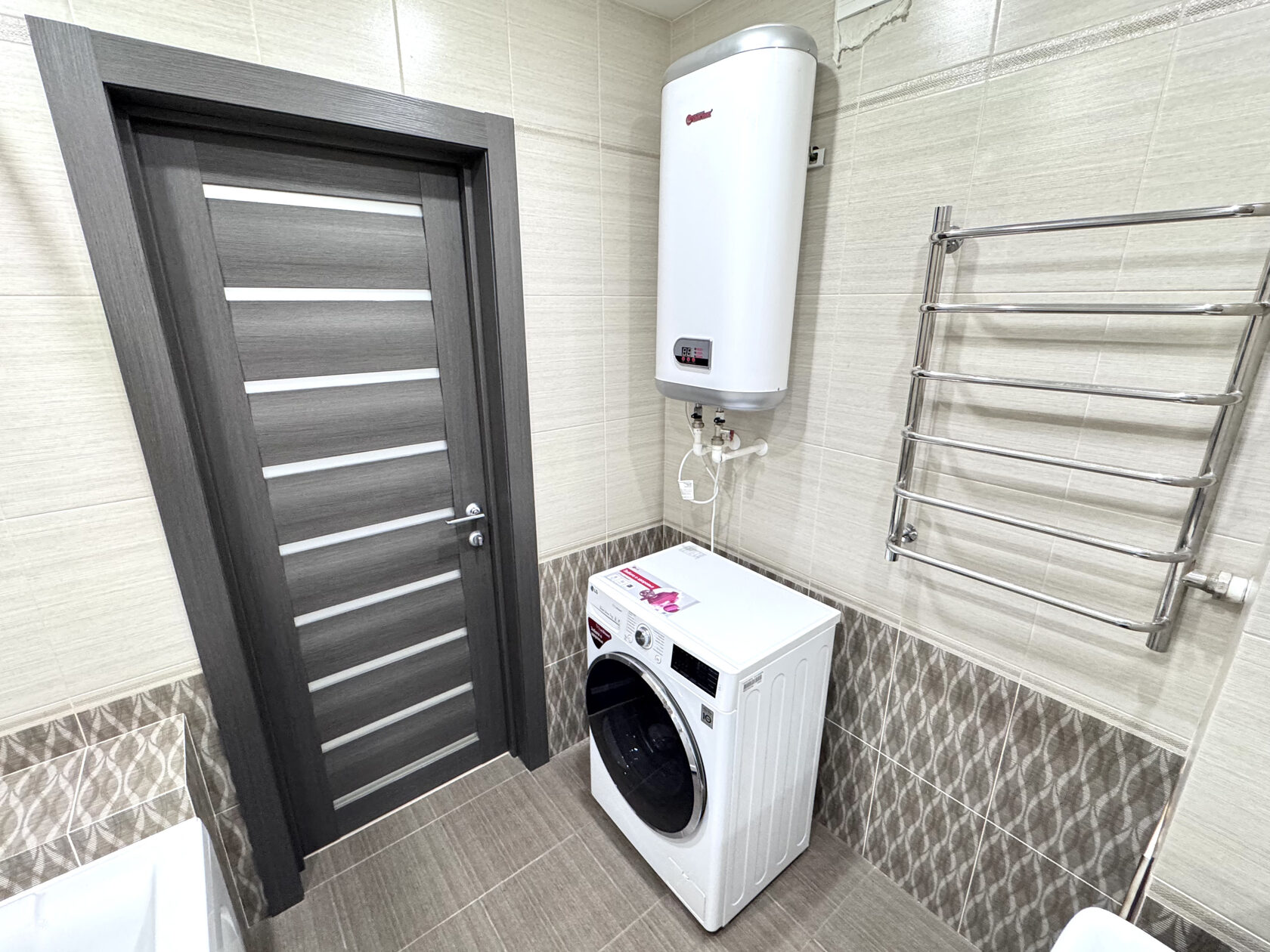 На полу в гостиной и спальной комнате качественный ламинат, на стенах обои, потолки натяжные со встроенными премиальными светильниками и люстрами. В санузле установлена акриловая ванна, водонагреватель горячей воды, и ванная мебель.